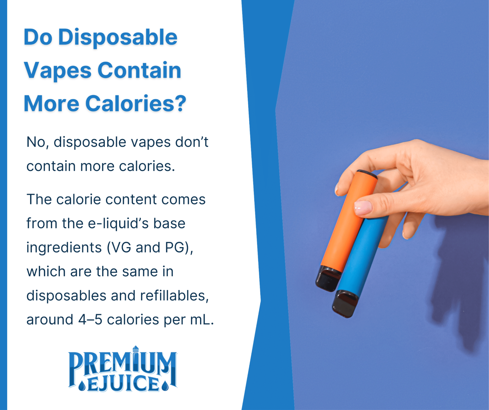No. Whether you’re using a refillable vape, a pod system, or a disposable, the caloric content is determined by the PG/VG base, not the hardware. A 2mL pod in a disposable vape will have about 8–10 calories total, just like any other e-liquid.