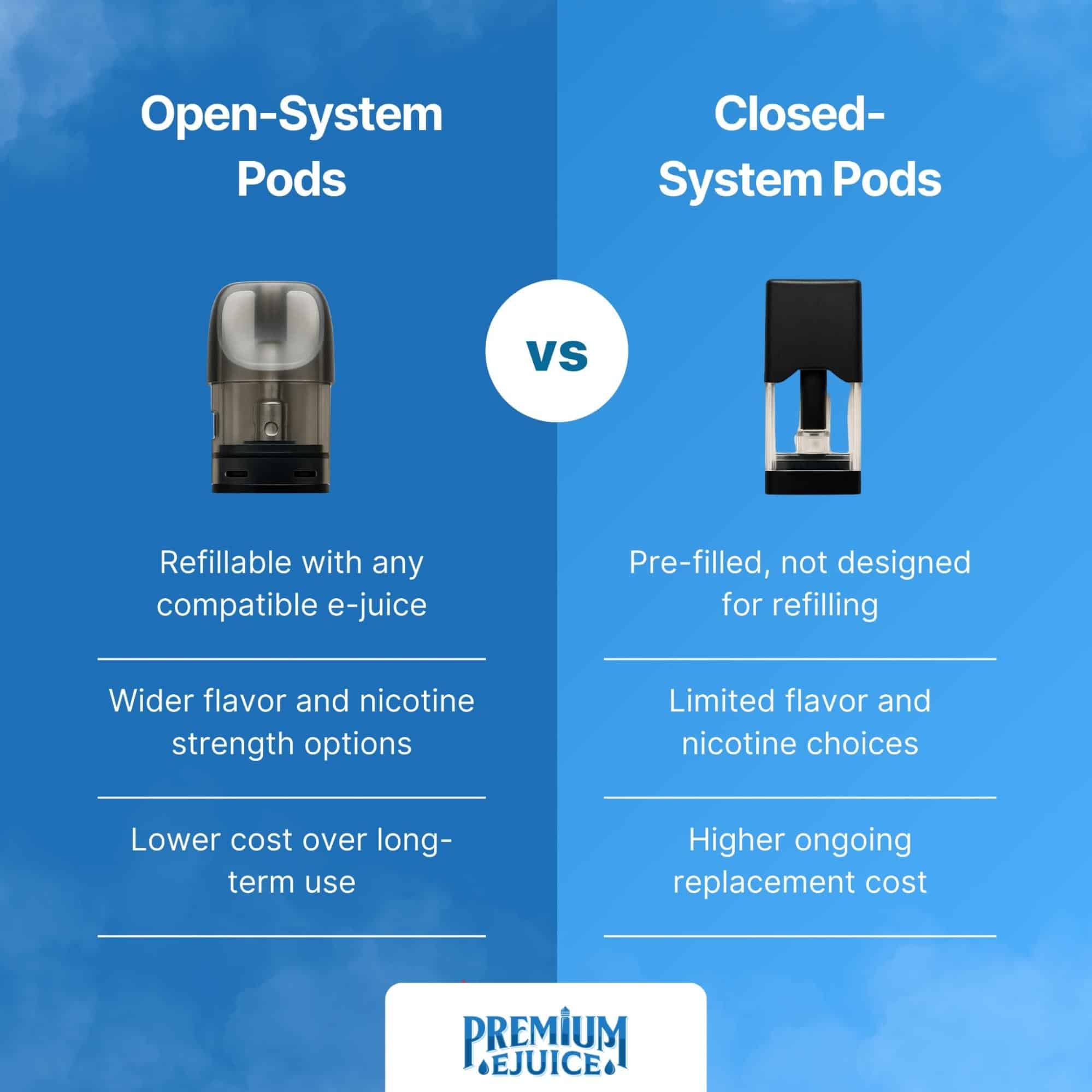 - Closed-system pods: They come prefilled from the manufacturer. They’re sealed to lock in flavor and reduce handling, but this means fewer flavor choices, a fixed nicotine strength, and higher costs over time. Some can be refilled with careful modification, but this often voids warranties and increases leak risk.