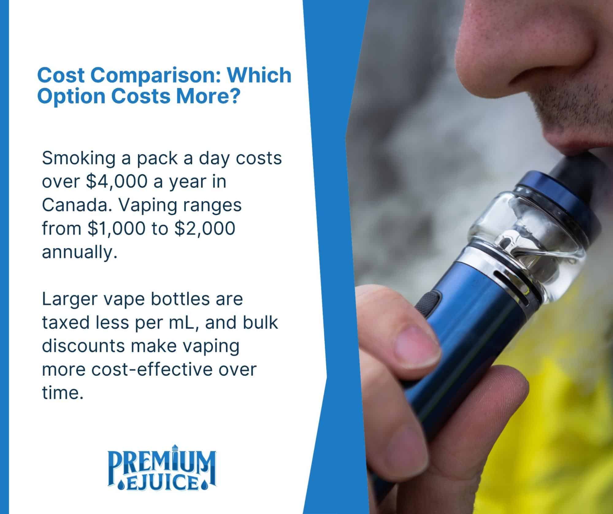 Switching to vaping doesn’t just cut down your exposure to toxins, it can significantly cut your costs as well. A typical vaping setup, including a starter device, coils or pods, and regular ejuice, comes in around $1,000 to $2,000 per year, depending on usage and product choice.